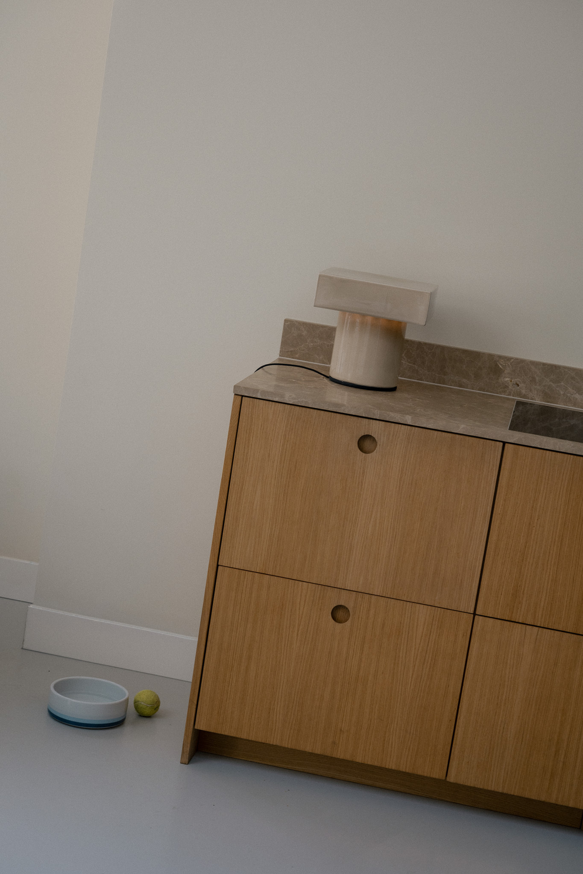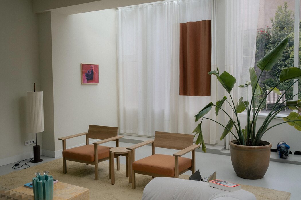 “Vanwege het minimalistische design en de mooie materialen. Het hout van de Base Chair vind ik echt prachtig — dit is helemaal mijn kleur hout. En de oranje stof vind ik geweldig, vooral hoe het matcht met ons vloerkleed en de marmeren salontafel. Ze zitten trouwens verrassend lekker, dat had ik stiekem niet verwacht!”