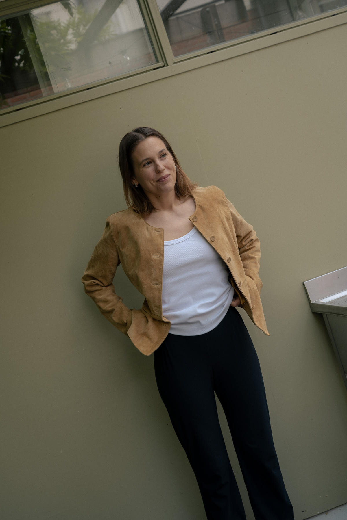 “Net als bij mijn interieur ga ik bij mode heel erg af op mijn gevoel. Voor mij is dat het belangrijkste — het moet echt kloppen en voelen als iets van mij. Een huis is natuurlijk nog persoonlijker dan een kledingmerk. Ik zou voor REYÈM nooit iets maken wat ik zelf niet mooi vind, al zitten er soms items tussen die ik persoonlijk wat minder draag. Het blijft een zoektocht naar de juiste balans: wat wil de klant, wat past bij het merk en wat vind ik zelf tof? Kleur blijft een lastig aspect. We werken met één stof en sommige kleuren doen het daarin minder goed. Dat beperkt, maar maakt het juist ook creatief.”