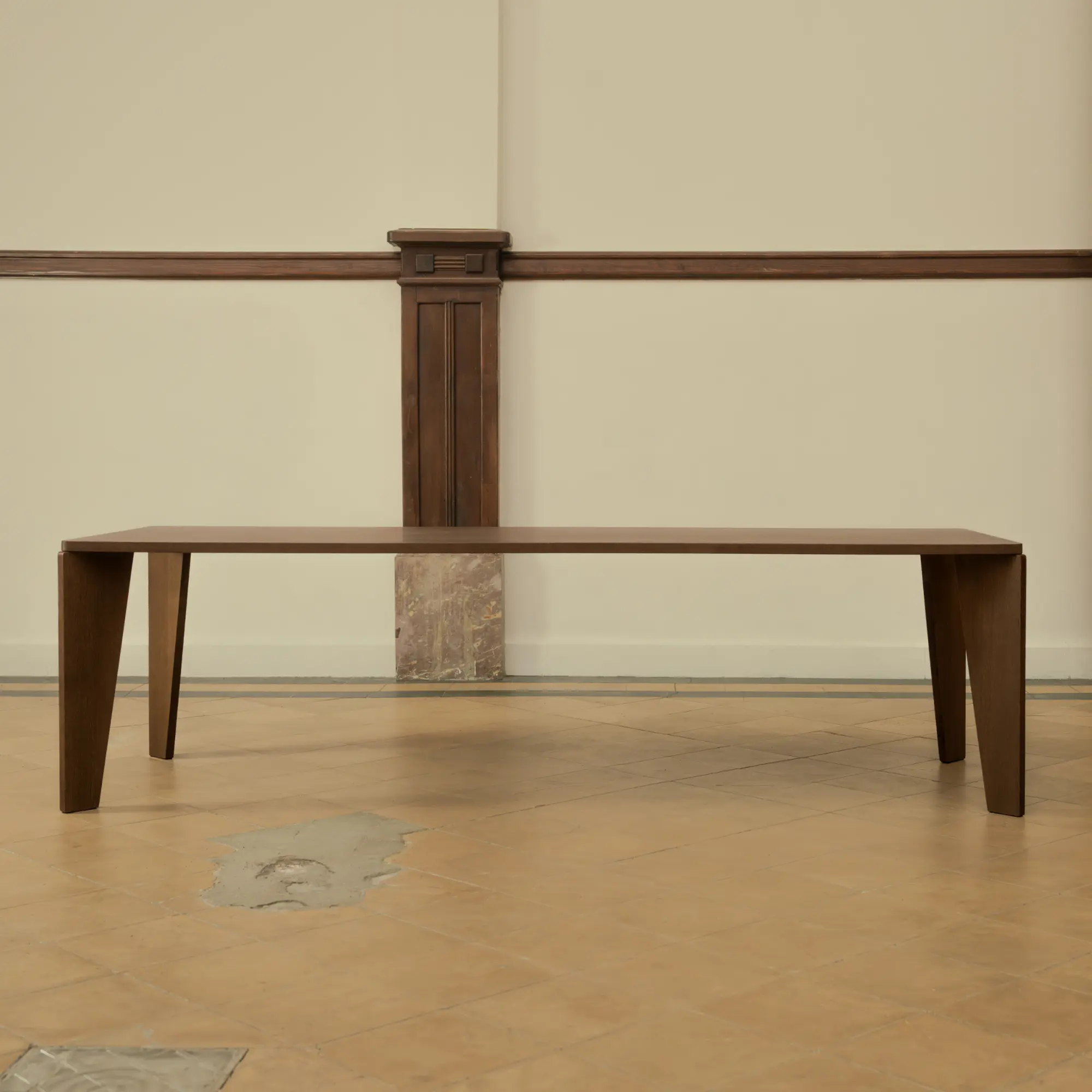 De heldere lijnen en zichtbare constructie geven de tafel een rustige, zelfverzekerde uitstraling die zich vanzelf voegt in de ruimte. Verfijnde houtverbindingen laten het vakmanschap zien zonder de aandacht op te eisen.